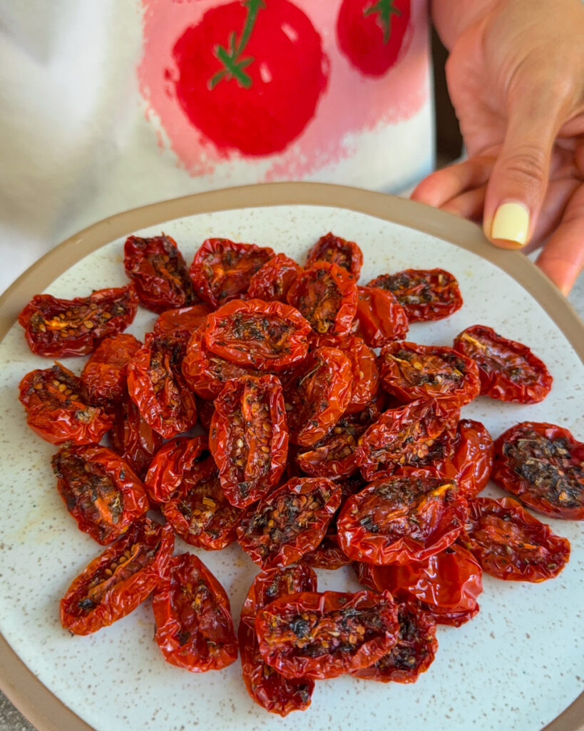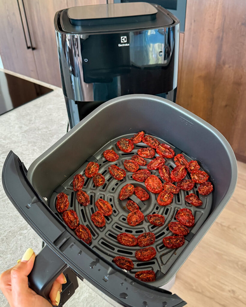 Gamyba man visiškai nesudėtinga, nes mano turima švedų gamintojo Electrolux karšto oro gruzdintuvė (modelis Electrolux EAF7SB) turi ne tik karšto oro bei kepimo garuose funkciją, bet ir maisto džiovinimo funkciją, kuri pravečia džiovinant ir vaisius, uogas, grybus, prieskonines žoleles. Labai patinka toks vieno prietaiso universalumas! Tik neišsigąskite, – pagaminti tokius pomidorus galite ir orkaitėje.