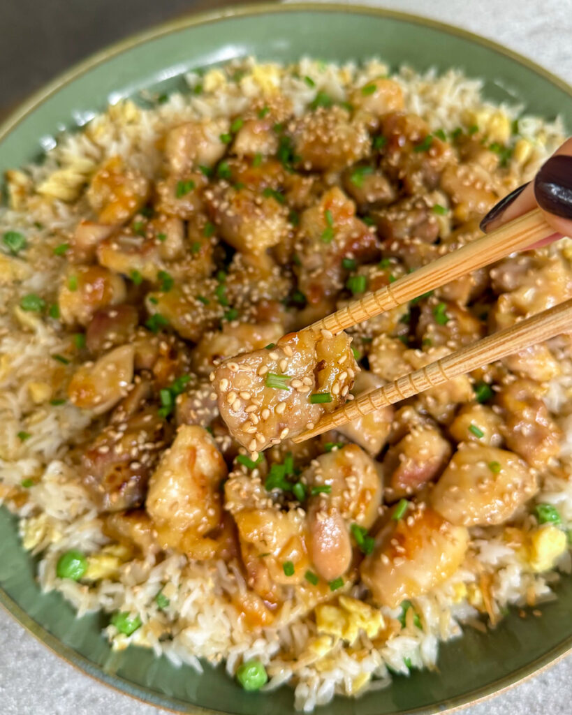- Ruošiame ryžius: Keptuvėje įkaitiname aliejų, pilame plaktus kiaušinius ir kepame 2 minutes visą laiką intensyviai maišydami, kad susidarytų maži gabalėliai. Sudedame virtus atvėsusius ryžius, žirnelius ir kepiname dar porą minučių. Pilame sojos padažą, skrudintų sezamų aliejų, išmaišome.