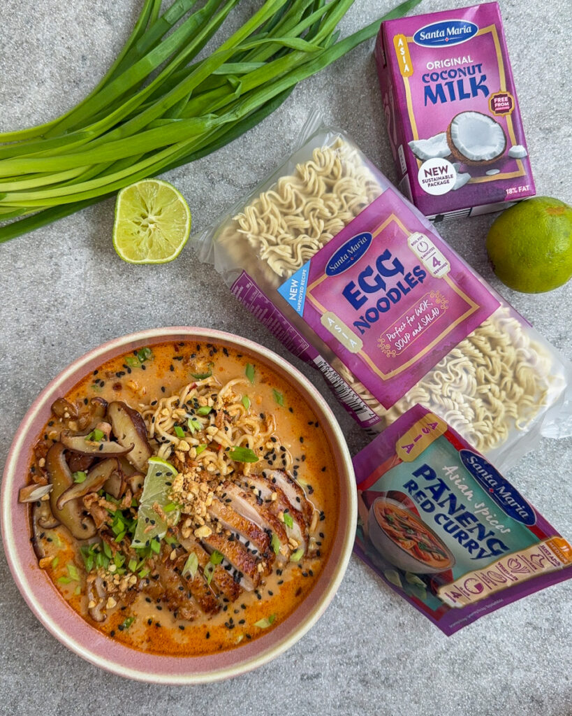 Kokia žiema, tokia ir sriuba – šildanti, soti ir labai skani. Nors tailandietiška raudonojo kario sriuba skamba kiek egzotiškai, tačiau su SANTA MARIA raudonojo kario prieskonių mišiniu ir kokosų pienu lengvai ir greitai išgausite autentišką skonį. O kartu su ryškaus skonio sultiniu čia derinau SANTA MARIA kiaušininius makaronus, vištieną ir shiitake grybus. Skonis nuostabus, paruošite per 20 minučių, tad būtinai išbandykit.