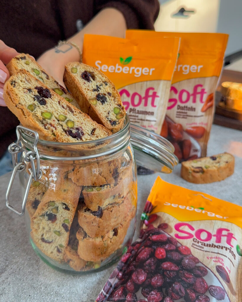 Biskočiams puikiai tinka patys įvairiausi riešutai iqr džiovinti vaisiai. Aš šį kartą gaminau su pistacijomis, džiovintomis spanguolėmis, datulėmis ir slyvomis. Sausainiams labai rekomenduoju SEEBERGER Soft linijos džiovintus vaisius, kurie pasižymi ypatingu minkštumu ir drėgnumu, todėl kepiniuose nesudega, išlieka sultingi ir pilni skonio. Žinoma, skanūs jie ir tiesiog vieni, bet kepiniuose gerokai pralenkia įprastus džiovintus vaisius.