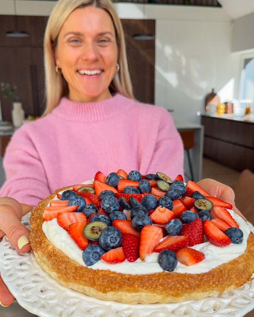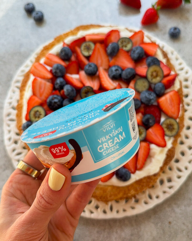 Ant sluoksniuotos tešlos lakšto tepu šilkinį kremą, kurio pagrindą sudaro kreminis sūris. Aš renkuosi Vilvi cream cheese original, su kuriuo kremo skonis ir tekstūra gaunasi tobulai, o 99% sudėties sudaro varškė. Ant viršaus dar kalnas šviežių uogų ir turime įspūdingo grožio ir skonio desertą.